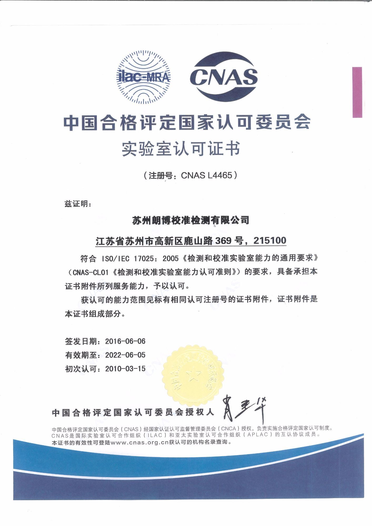 中國合格評定國家認可委員會實驗室認可證書
